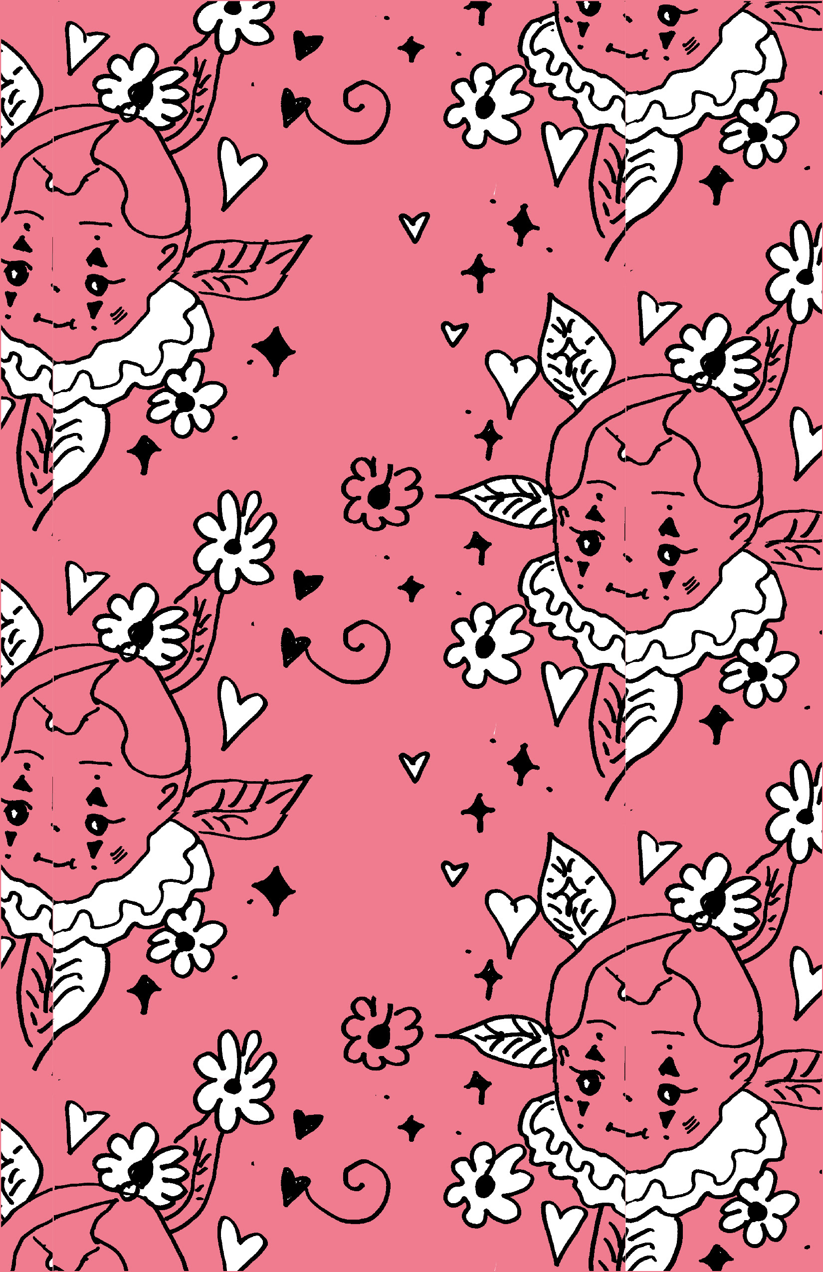 Pattern featuring clowns, sparkles, and floral designs.
