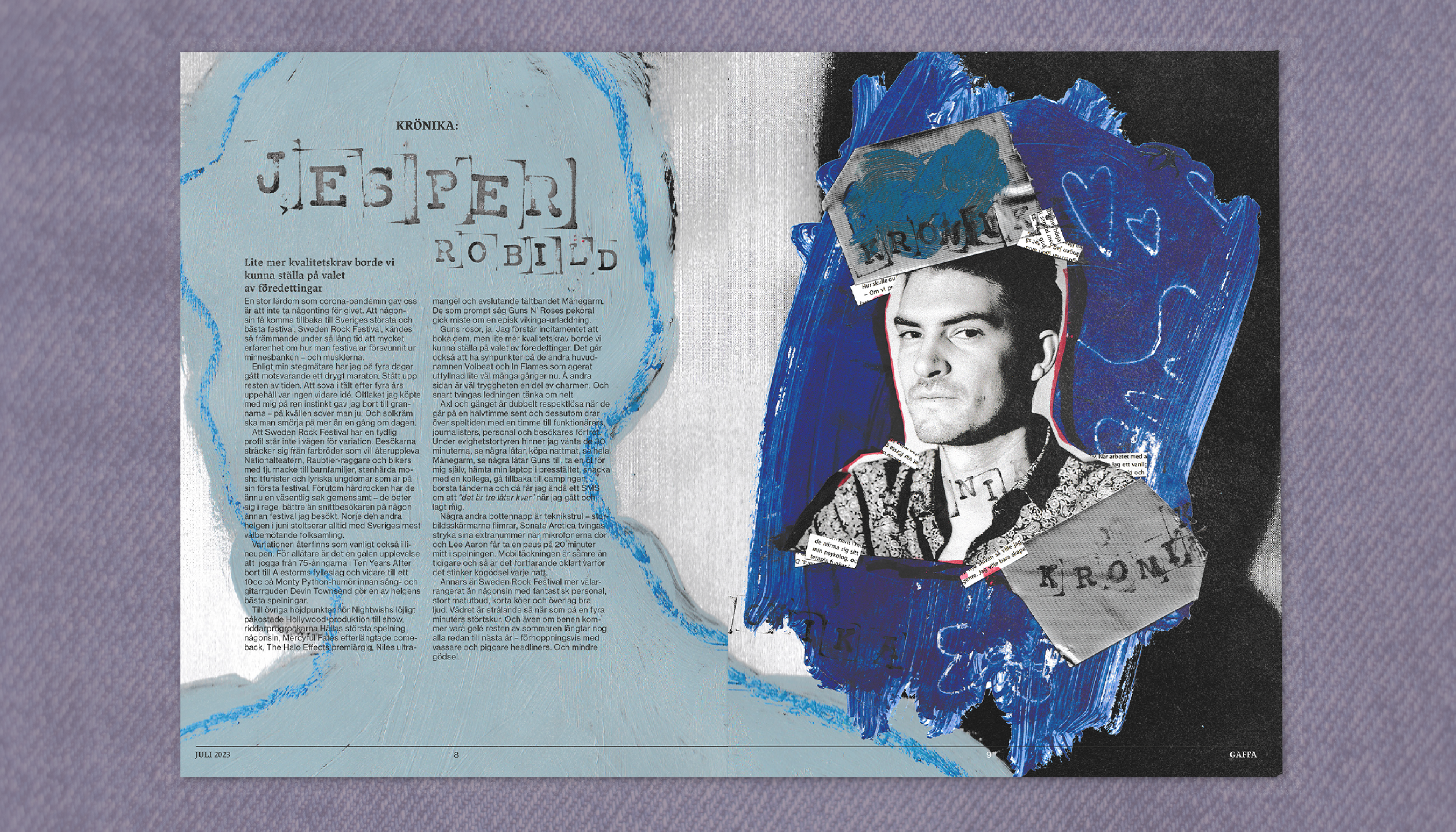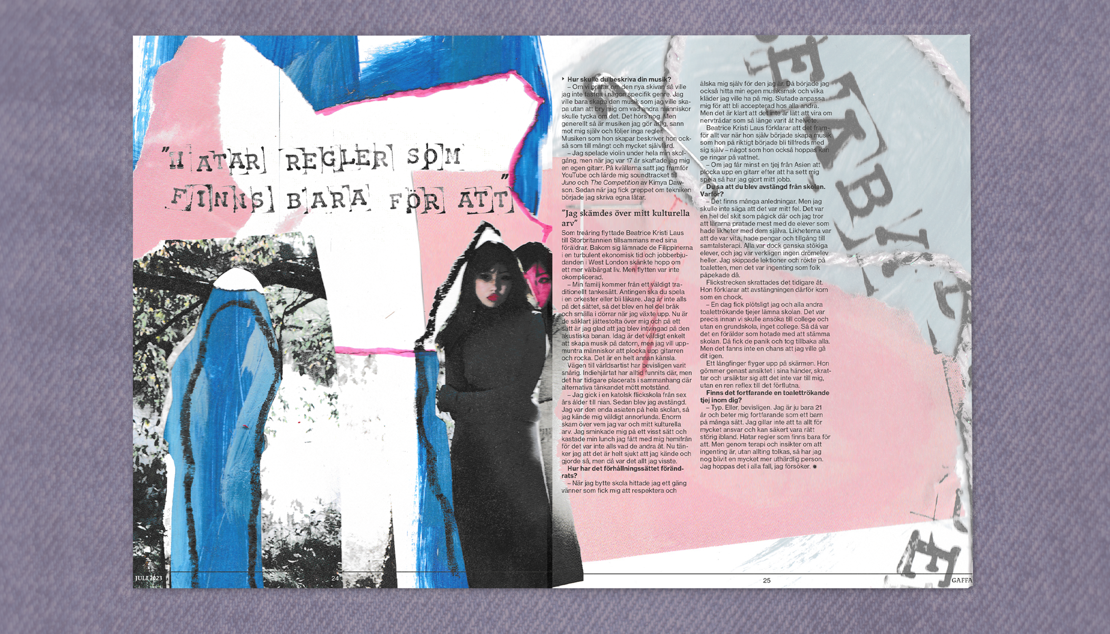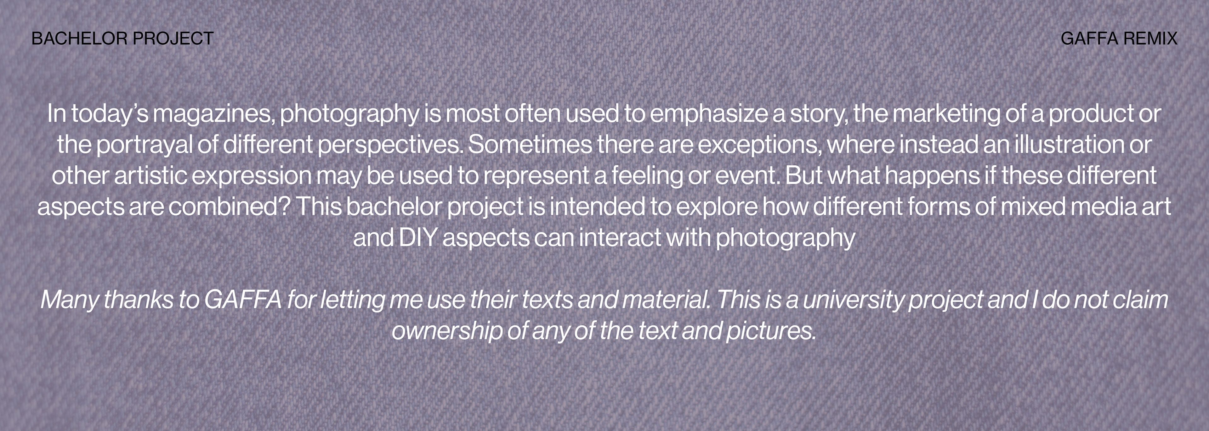 With this project I wanted to explore how different forms of mixed media art and DIY aspects can interact with photography, by taking an issue of music magazine GAFFA and re-mixing it to create a more dynamic and interesting narrative.